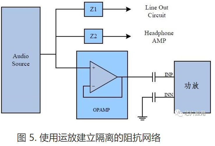 在某些系統(tǒng)中,主芯片的音頻信號(hào)輸出不僅需要連接到功放輸入,還要輸出到Line Out(線路輸出),或者其他的芯片進(jìn)行處理。該種情況下輸入級(jí)的網(wǎng)絡(luò)比較復(fù)雜,單端輸入模式的阻抗匹配不容易實(shí)現(xiàn)。為了解決這個(gè)問題,可以使用運(yùn)放接成一個(gè)簡(jiǎn)單的跟隨器來(lái)建立一個(gè)隔離的阻抗輸入系統(tǒng)。跟隨器的輸入阻抗很高,對(duì)源信號(hào)沒有影響。其輸出阻抗非常低,可良好匹配功放 的輸入阻抗網(wǎng)絡(luò)。圖 5 給出了使用跟隨器來(lái)建立一個(gè)隔離的輸入阻抗網(wǎng)絡(luò)的電路。需要時(shí),還可將運(yùn)放用來(lái)調(diào)節(jié)信號(hào)增益及濾波。