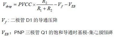 掉電檢測(cè)電路在正常供電時(shí)PVCC 會(huì)通過(guò)二極管D1 和電阻R1 向C1 大電容充電。掉電初期,Q1 的基極電壓將隨著PVCC 的跌落降低,直到跌落到Q1 三極管打開后,C1 的電壓將通過(guò)Q1送給Q2 的基極,Q2 導(dǎo)通,/SD 被拉低。根據(jù)上述原理,可由以下計(jì)算出電壓跌落的位置Vdrop: