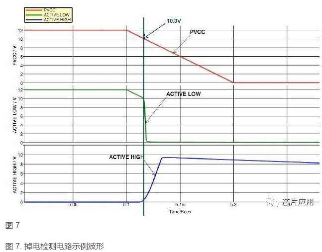 該例中,PVCC 為12V, Vf 和Veb 為0.7V, 則掉電保護(hù)點(diǎn)約在10.3V 左右,與波形圖8 吻合。