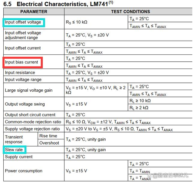對于新手或者從事芯片封裝行業(yè)的人員經(jīng)常拿到運放的技術手冊不會看,我們最近就以LM741 Operational Amplifier來進行講解,首先先看看圖1,里面涉及很多參數(shù),也是挑選運放最重要的指標,而前面已經(jīng)講述了Input Offset Voltage(輸入失調電壓)和Slew Rate(壓擺率),大概知道了他們的作用,對他們已經(jīng)有了一個大概的認識,那今天我們主要講解的內容就是Input Bias Current(輸入偏置電流)。