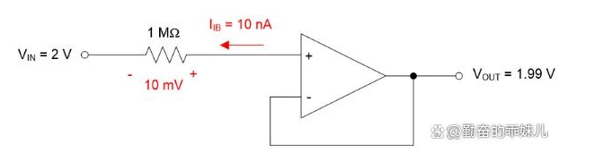 輸入偏置電流會影響放大器的輸出。例如,如果有一個大電阻與運算放大器輸入串聯(lián),則IB流過它并增加一個偏移量。例如,圖5中所示的原理圖。IB =10nA的電壓跟隨器電路(也稱為單位增益緩沖電路)中的1MΩ輸入電阻器會在電阻器上產(chǎn)生額外的10mV電壓降,從而導致10mV的輸出誤差。