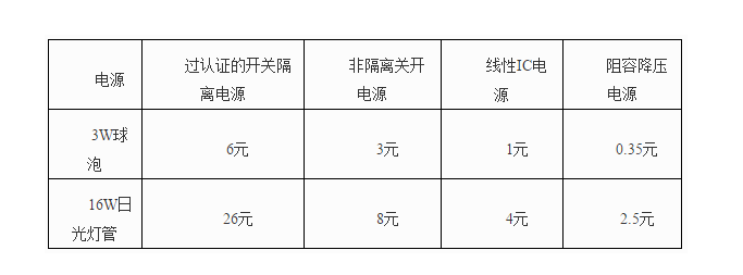 以3W小球泡和16W日光燈管為例,各種電源成本比較: