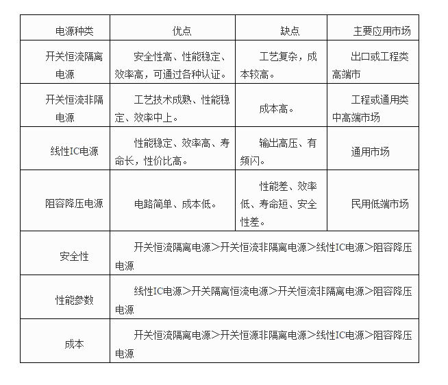 在中高端市場,開關恒流非隔離電源仍是市場的主流電源,廠家一般會在結(jié)構設計上進行防高壓隔離。而在低端市場,大部份廠家是采用阻容降壓電源,也有部分廠家采用線性IC電源(要求廠家有一定的設計能力)。采用不同的電源,產(chǎn)品的性能及價格是不一樣的,我們應該根據(jù)不同的市場選用不同的產(chǎn)品。