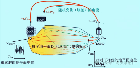 圖右邊給數(shù)字芯片供電的電源地為干凈的地平面,即電位基本為0V,而且波動(dòng)也很小。由于圖中左側(cè)的數(shù)字芯片MCU在工作時(shí),供電電流是隨機(jī)變化的,隨機(jī)變化的電流又通過芯片的數(shù)字地管腳通過數(shù)字地平面回流到電源的地。在這個(gè)過程中,由于數(shù)字地平面的電阻不完全為0Ω。因此,隨機(jī)變化的芯片工作電流在地平面上會(huì)有壓降,導(dǎo)致數(shù)字芯片的地管腳處的地電位比0V高,且是隨機(jī)變化的。圖中的黃色越深代表電位越高,顏色越淺,代表電位越低。