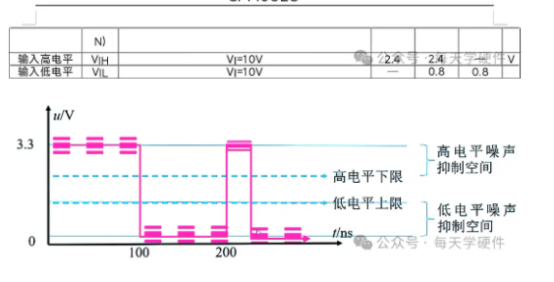 很多時(shí)候,數(shù)字地管腳處的這種電壓波動(dòng)對(duì)于數(shù)字系統(tǒng)一般不會(huì)產(chǎn)生影響。數(shù)字電路的低電平和高電平一般都有一個(gè)電壓范圍,比如下圖所示的開關(guān)。其高電平范圍為≥2.4V,低電平范圍為≤0.8V,因此對(duì)于電壓噪聲有一定的容忍度。