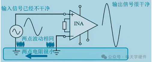 當(dāng)兩點(diǎn)的地電位存在相同的波動(dòng)時(shí),由于運(yùn)放放大的是兩者的差值,又因?yàn)閮牲c(diǎn)的波動(dòng)相同,因此差值是固定的,因此,電路的輸出并不會(huì)受到很大的影響。但如果兩點(diǎn)的地電位差值很大,那么這個(gè)差值就會(huì)被系統(tǒng)放大,從而疊加到輸出中,使系統(tǒng)的輸出不再干凈。