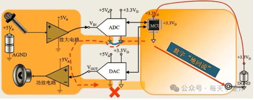 由于數(shù)字系統(tǒng)的地和模擬系統(tǒng)的地只進(jìn)行了單點(diǎn)連接,因此數(shù)字芯片變化的電流回到地的路徑就不會(huì)經(jīng)過模擬系統(tǒng)。