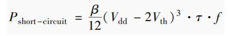 第二項為短路功率,當PMOS和NMOS 晶體管在邏輯單元開關電路中時,在轉換期間,有一個短暫的瞬間,兩個晶體管同時導通。這將在電源和地之間創(chuàng)建一個直接的通路。這個功耗取決于輸入信號的斜率和負載電容。因此用一個公式對所有的工作狀態(tài)下的功耗進行建模,是很困難的。
