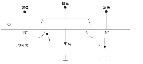 漏電流的另一個組成部分是反向結電流IR,當PN結反向偏置時,電路流經帶間隧穿(BTBT) 節(jié)點。電流IR與柵極或者源極耗盡區(qū)的面積大小相關。IR也與結電場及結的摻雜濃度有關。 由于柵極和源極與襯底有關,因此兩極的勢能越高,越會導致更大的帶間隧穿。盡管在高溫下(~150℃),漏電流的組成部分具有溫度依賴性,但是在低溫下,它的溫度敏感性很低。