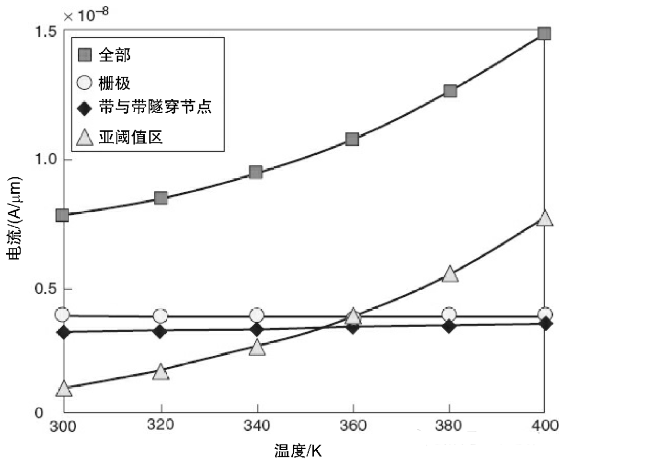 漏極和源極的耗盡區(qū)擴展到通道內時,其對電磁場和溝道內電勢的影響會增大,這個叫做短通道效應(short channel effect,SCE)。當通道長度變短時,SCE將導致閾值電壓的碾軋效應。因此減小器件尺寸,可以帶來閾值電壓的減小,隨后會產生更大的亞閾值漏電流。此外, 該電流與溫度具有超線性關系,如圖所示,所以該電流成為電源管理中的一個重要參數(shù)。電流IG是流經柵極氧化層的電流,該電流由載流子隧道效應產生。