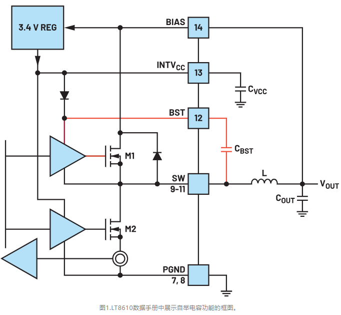 自舉電容負責維持頂部N溝道MOSFET正常運行。圖1的橙色高亮部分顯示了這一點。