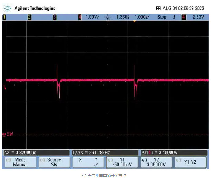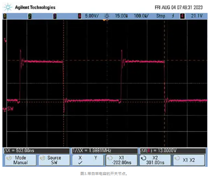 為了解決這個問題,設計人員必須添加自舉電容。設計人員如果不確定要添加多大的電容,則應在數(shù)據(jù)手冊示例中選擇一個最接近其應用的值。如果器件需要自舉電容,忘記添加該電容將導致SMPS故障。添加自舉電容將能讓頂部柵極驅動器有足夠的驅動強度來操作處于飽和區(qū)的FET,使其充當開關,并向SW節(jié)點提供全部輸入電壓。這一點可以從圖3中看出。