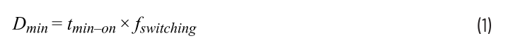 設計人員常常選擇較高的開關頻率以減小電路板尺寸,但由于開關損耗增加,能效比會降低。然而,當器件具有高頻率和高降壓比時,占空比會被迫變小,并可能降至最小占空比值以下。最小占空比如公式1所示。