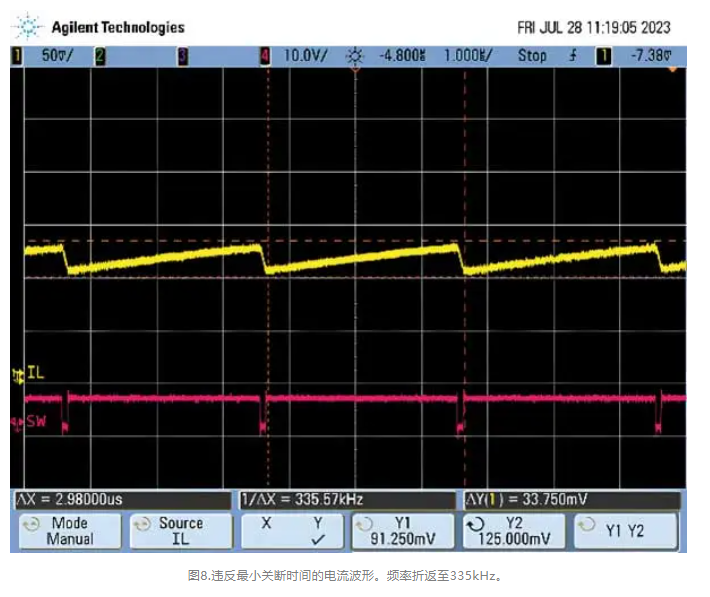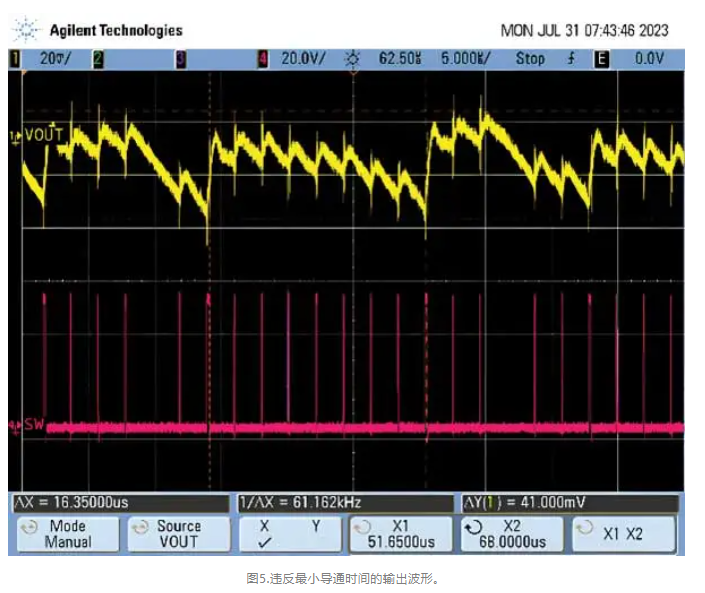 與最小導通時間相反,降低頻率只會在一定負載以下起作用。如果設計人員不能充分降低開關頻率以避免違反最小關斷時間規(guī)范,那么理想的做法是選擇另一種能夠處理更高占空比和更短導通時間的器件。