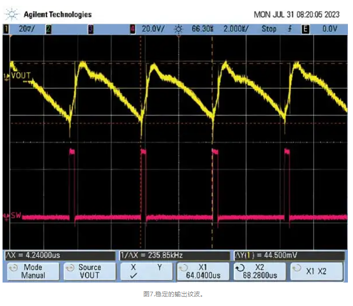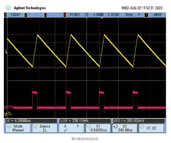 這個問題有一個簡單的解決辦法。導通時間主要受開關頻率影響,因此設計人員可以通過降低頻率來解決該問題。但這樣做的代價是需要更大的功率級元件,主要是更大的電感。降壓轉換器的功能改進體現(xiàn)在周期間一致的導通時間,以及圖6中穩(wěn)定的電流紋波和圖7中穩(wěn)定的輸出紋波。