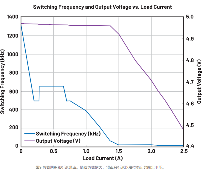 在圖9中可以看到,隨著負載增加,器件頻率會折返以保持恒定的輸出電壓。器件在DCM下運行至約0.28A,這就是頻率下降到約495kHz然后又回升至657kHz的原因。以657kHz的頻率運行時,器件可以保持正常操作,直至負載達到0.7A。此時頻率降低以保持適當?shù)妮敵鲭妷?,直至負載達到1.4A左右。發(fā)生這種情況時,器件無法在保持輸出電壓的同時將頻率降低到100kHz以下(該器件指定的最低反饋頻率),因此輸出電壓開始下降。