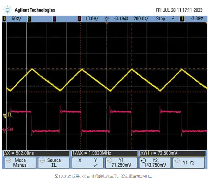 這個問題的解決辦法不像違反最小導通時間規(guī)范那么簡單。設計人員通常需要滿足特定的輸入電壓和輸出電壓要求,因此無法隨意更改占空比來延長關斷時間。如果設計人員可以提供更大的輸入電壓,則器件將以設定的頻率工作,因為較小占空比會防止器件違反最小關斷時間規(guī)范。這一點可以從圖10中看出,其中器件以設定的2MHz頻率運行。
