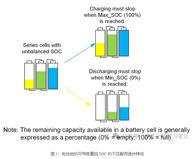 為了最大限度地提高每個(gè)電芯的可用容量和使用壽命,必須在所有電芯在 SOC 范圍內(nèi)運(yùn)行的同時(shí),盡量減少電芯的退化。實(shí)際上,只需將電芯保持在受限的 SOC 范圍內(nèi),不干預(yù),即可避免電芯的退化,但其可用容量還是會(huì)隨著 SOC 的不匹配而逐漸減少。這是因?yàn)?,?dāng)一個(gè)電芯達(dá)到 SOC 上限或下限時(shí),充電或放電就必須停止,即使其他電芯還有剩余容量(見圖 1)。