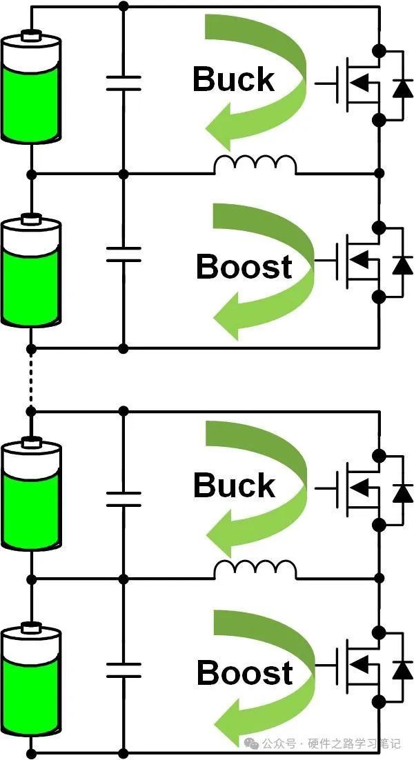 升降壓主動(dòng)平衡器采用的方法更簡(jiǎn)單,它利用了常用的升降壓電池充電器技術(shù)。升降壓主動(dòng)平衡是將電荷移動(dòng)到直接相鄰的電芯,而不是將電荷移動(dòng)到電池組的各個(gè)位置或單獨(dú)的電源軌,這極大地簡(jiǎn)化了平衡電路,并充分利用多個(gè)平衡器的同時(shí)操作將電荷分配到整個(gè)電池組中。