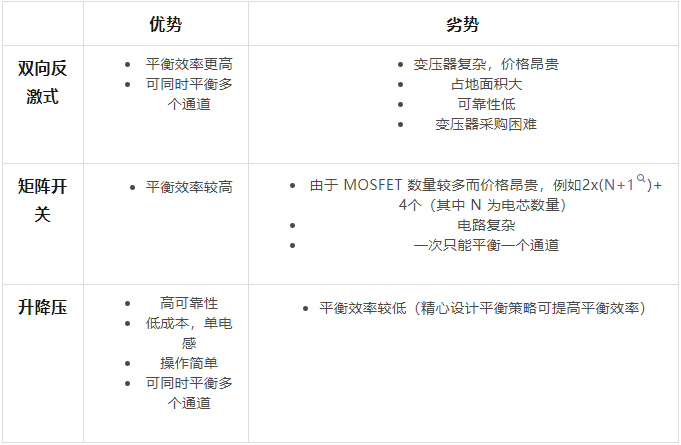 在三種類型的主動(dòng)平衡器中,雙向升降壓主動(dòng)平衡器最簡(jiǎn)單,也最可靠。表 1 對(duì)這三種主動(dòng)平衡方法進(jìn)行了比較。