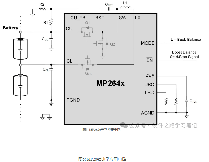 MP264x 系列器件(如MP2641、MP2642和MP2643)是高度集成的雙向升降壓主動(dòng)平衡器,它們可以在兩個(gè)串聯(lián)的鋰離子電芯之間提供高達(dá) 3A 的電荷重分配(見圖 6)。該系列器件可用于所有常見的鋰離子電池化學(xué)成分,例如 NMC、NCA、鋰聚合物和 LFP。MP264x 可有效地在電芯之間移動(dòng)電荷,最大限度地減少平衡時(shí)間和熱量的產(chǎn)生。MP264x 還可以補(bǔ)償不匹配的電池容量,從而延長(zhǎng)電池使用時(shí)間。為了保證安全的運(yùn)行,MP264x 還提供 CL 和 CU 過(guò)壓保護(hù) (OVP) 和欠壓保護(hù) (UVP),以及過(guò)溫關(guān)斷保護(hù)。MP264x 系列采用 QFN-26(4mmx4mm)封裝。