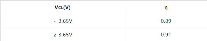 其中 VCL 為低電池電壓(CL 和 AGND 之間),VCU 是兩個(gè)串聯(lián)電芯的電壓(CU 和 AGND 之間)。VCL 和 VCU 均指未啟用平衡功能時(shí)測(cè)得的電壓。η 是變換器的升壓平衡效率;該值取決于電芯電壓,因此需合理選擇(見表 2)。