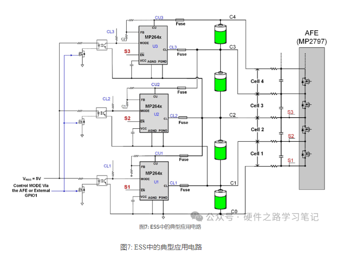 將多個(gè) MP264x 器件組合在一起,可以將主動(dòng)平衡功能擴(kuò)展到任意數(shù)量的串聯(lián)電芯,電荷可以重新分配到電池組內(nèi)的任意電芯。圖 7 顯示了三個(gè) MP264x 器件串聯(lián)在一起的 4 芯電池主動(dòng)平衡功能示例。