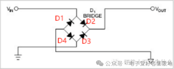 電路中接入整流橋,當(dāng)正接時(shí),電流通路流經(jīng)D2、負(fù)載、輸出GND、D4、輸入GND形成回路。如果反接,電流流經(jīng)D3、負(fù)載、輸出GND、D1、輸入GND形成回路。因此正反插都能正常使用。