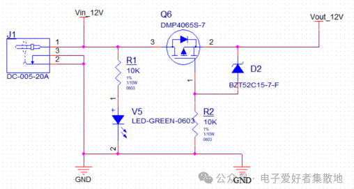 當(dāng)電源正常接入時(shí),LED亮,表示輸入正常。由于MOS管中的體二極管的存在,從而使得電流經(jīng)過負(fù)載、MOS管的寄生二極管到GND,形成回路,而MOS管的Vgs>Vgs(th),從而使MOS管導(dǎo)通,導(dǎo)通后體二極管被MOS管導(dǎo)通短路,從而可以通過更大的電流。