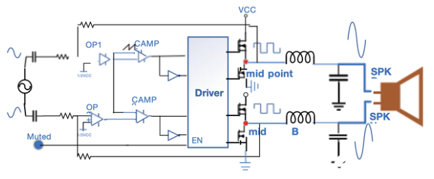 Class D 功率放大器輸出與輸入音頻信號(hào)相對(duì)應(yīng)的 脈沖,A 點(diǎn)和 B 點(diǎn)的脈沖由半橋開(kāi)關(guān)產(chǎn)生。低通濾波器 由電感和電容組成,為從這些高頻脈沖中解調(diào)出的音頻 信號(hào)提供路徑,解調(diào)后的音頻信號(hào)通過(guò)揚(yáng)聲器,將電能轉(zhuǎn)換為聲能,然后被人的耳朵聽(tīng)到。如果用戶(hù)在開(kāi)始播放音樂(lè)或計(jì)劃停止音樂(lè)時(shí)總是聽(tīng)到爆裂聲或點(diǎn)擊聲,這將是非常糟糕的體驗(yàn)。