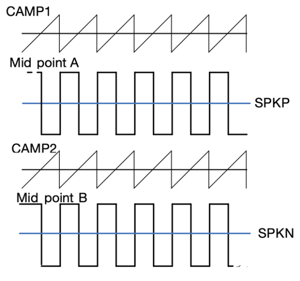 因此,揚(yáng)聲器端子 SPKP 和 SPKN 之間的電壓水平 相同,沒(méi)有電壓偏差導(dǎo)致電流流入揚(yáng)聲器的線(xiàn)圈,當(dāng)然 也不會(huì)有點(diǎn)擊或POP噪聲?,F(xiàn)在我們來(lái)看實(shí)際的模擬電 路:元件的公差、參考點(diǎn)的位置不同、驅(qū)動(dòng)器的時(shí)間方 案差異、PCB 走線(xiàn)因素等。所有這些差異導(dǎo)致 A 點(diǎn)的 PWM 與 B 點(diǎn)的 PWM 不匹配,即使在相同的初始條件 下啟動(dòng)也是如此。圖 4 是功率放大器從靜音到取消靜音 時(shí)的實(shí)際波形。調(diào)制器開(kāi)始工作并將占空比從小調(diào)節(jié)到 50%,這是功率放大器在啟動(dòng)階段的循環(huán)階段,PWM 的目標(biāo)是在功率放大器環(huán)路穩(wěn)定后保持輸出平均水平等 于 1/2VCC。