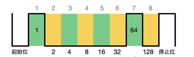 注:圖中每一位所對(duì)應(yīng)的1 2 4 8、、、是二進(jìn)制的權(quán)(其中第一位可以看成2的0次方,第二位是2的1次方,依此類推)