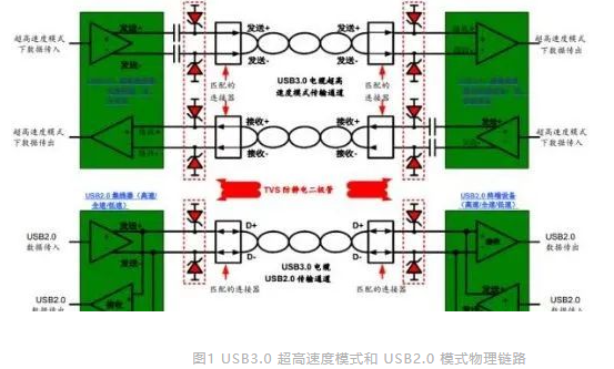 為了支持 USB3.0 電纜所包含的全部線路,必須強制規(guī)定采用一種新的連接器形狀。新的 USB3.0 連接器的基本要求是,必須向下兼容 USB2.0 連接器。從靜電防護的角度而言,這導致標準 A連接器的超高速度模式線路很容易被靜電擊中(在主機側和器件側)。一種強有力的對策是在USB3.0 鏈路中實現(xiàn)高效的靜電防護機制。