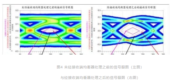 圖4所示為整個USB3.0鏈路的眼圖模擬(誤碼率為1E6時)。在圖4(左圖)中,接收信號是在未經(jīng)接收端均衡器處理之前測得的。在圖(右圖)中,信號是經(jīng)接收端均衡器處理之后測得的。