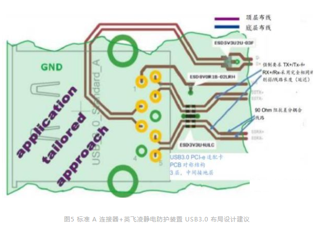 圖 5 所示為兼具靜電防護電路的 USB3.0 標準A連接器橫截面布局設計示例。