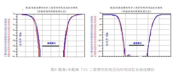 分別在未配備 TVS 二極管(紅色輪廓線)和配備了 TVS 二極管(ESD3V3U4ULC,藍色輪廓線)的情況下,計算出眼圖的張開程度。(參見圖 7)