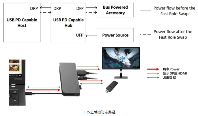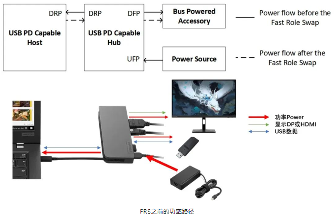 這種場(chǎng)景下,想象一下用戶可能正在拷貝U盤,或通過Hub外接顯示器給客戶展示產(chǎn)品方案,用戶無(wú)意中拔掉了Type-C電源,那么對(duì)于不支持FRS功能的產(chǎn)品,用戶會(huì)發(fā)現(xiàn),由于供電突然中斷,U盤拷貝也因中斷而失敗了,顯示器黑屏了,直到筆記本作為Source重新啟動(dòng)供電。這時(shí),用戶不得不重新進(jìn)行U盤拷貝,并尷尬地向客戶解釋剛剛發(fā)生的狀況。