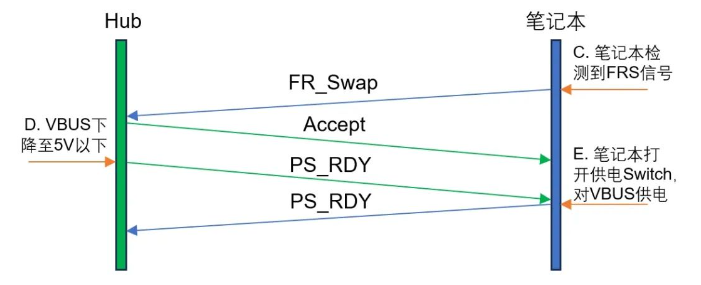 D. VBUS電壓持續(xù)下降,Hub和筆記本會(huì)同時(shí)檢測(cè)VBUS降至5V以下。Hub會(huì)向筆記本發(fā)送PS_RDY(如下步驟5);