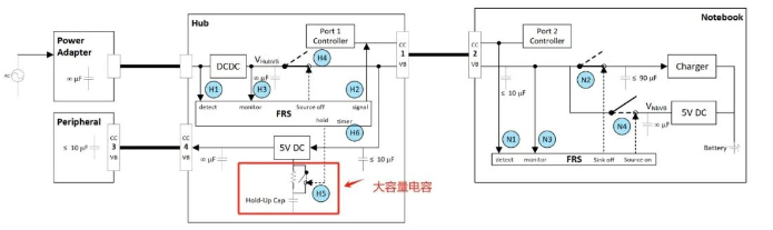 在硬件設(shè)計(jì)上,Hub內(nèi)部需要增加一個(gè)大容量電容,以保證FRS過程中(步驟D-E),盡可能地維持電壓穩(wěn)定。