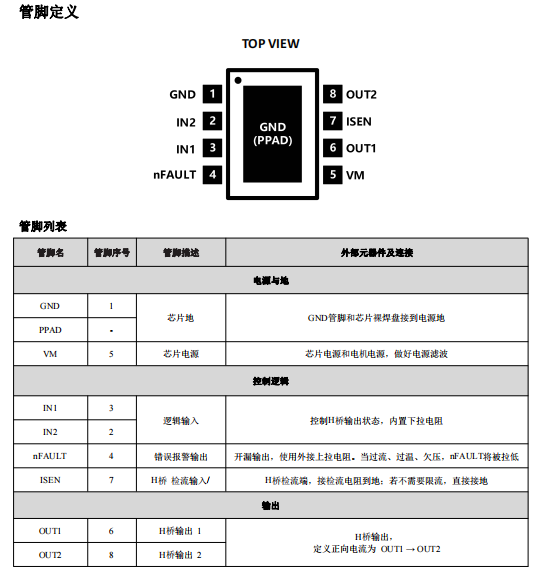 進入低功耗休眠模式。AT8872集成電流限制功能,該功能基于內(nèi)置模擬VREF以及ISEN引腳的電壓。該器件能夠?qū)㈦娏飨拗圃谀骋灰阎剑@可顯著降低系統(tǒng)功耗要求,并且無需大容量電容來維持穩(wěn)定電壓,尤其是在電機啟動和停轉(zhuǎn)時。內(nèi)部關(guān)斷功能包含過流保護,短路保護,欠壓鎖定和過溫保護,并提供nFAULT故障檢測輸出。AT8872提供一種帶有裸露焊盤的ESOP8封裝,能有效改善散熱性能,且是無鉛產(chǎn)品,符合環(huán)保標(biāo)準(zhǔn)