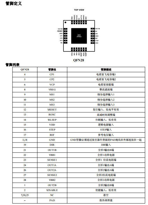 譯碼器是HR4988易于使用的關鍵。通過STEP管腳輸入一個脈沖就可以使電機完成一次步進,省去了相序表,高頻控制線及復雜的編程接口,使其更適于沒有復雜的微處理器或微處理器負擔過重的場合。在步進操作期間,HR4988的內(nèi)部電路可以自動的控制其PWM操作工作在快、慢及混合衰減模式。在混合衰減模式下,器件初始經(jīng)過一段時間的快衰減后,將切換至慢衰減模式直至固定衰減時間結束?;旌纤p模式控制不但降低了電機工作時產(chǎn)生的噪聲,還增加了步進的準確性,同時減小了系統(tǒng)的功耗。內(nèi)部的同步整流控制電路改善了PWM操作時的功耗。內(nèi)部保護電路包括:帶遲滯的過熱保護、欠壓鎖定 及過流保護。不需要特別的上電時序。HR4988目前提供帶有裸露焊盤的QFN28封裝,能有效改善散熱性能,且是無鉛產(chǎn)品,符合環(huán)保標準。