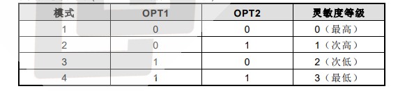 ? 改變靈敏度等級(通過 OPT 引腳配置 4 級)