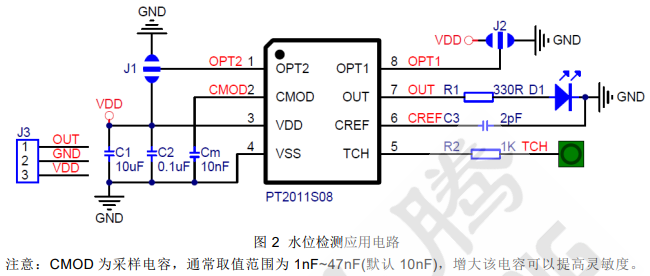 PT2011 是一款電容式水位檢測專用 IC, 它可以通過水槽外壁來檢測水位的變化。該芯片具有寬工作電壓、低功耗、高抗干擾能力的特性。