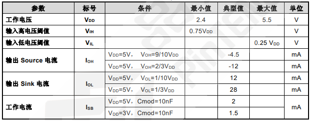 ● 工作電流約 2mA@VDD=5V/CMOD=10nF
