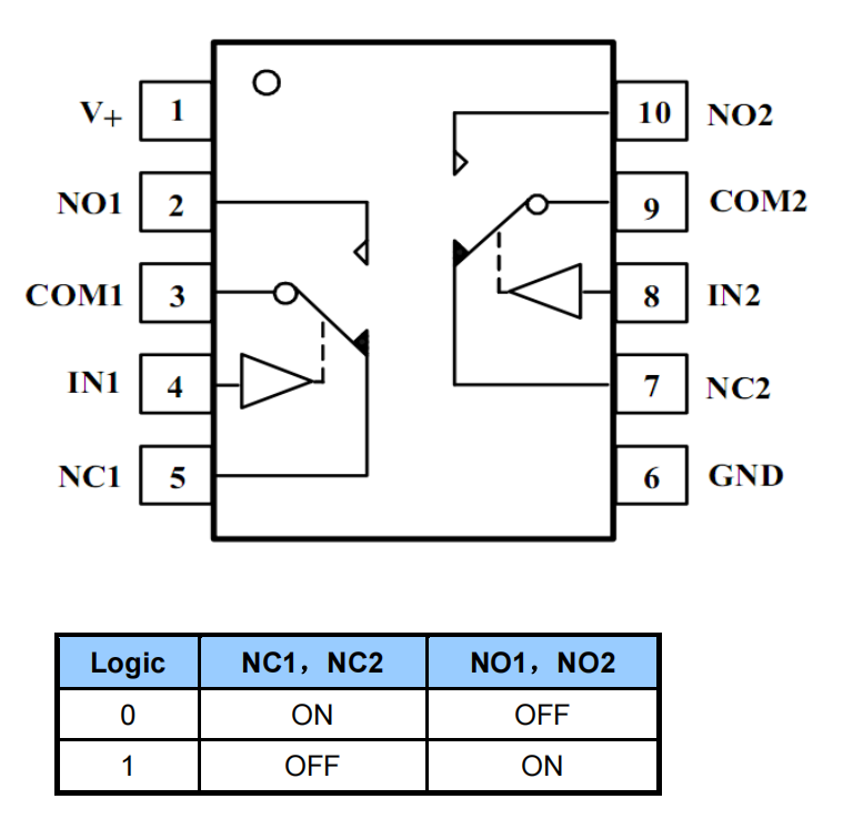 其極低的開關(guān)阻抗——0.5Ω(TYP)和快速開關(guān)時(shí)間——tON=16ns, tOFF=15ns,可以大大減少電池供電便攜式產(chǎn)品的信號(hào)損失,改善音頻及視頻輸出級(jí)。LN3005在封裝上采用了DFN-10和MSOP-10的封裝,體積小巧,節(jié)省了很多空間。LN3005集成了兩個(gè)單刀雙擲開關(guān),由兩個(gè)常開NO和兩個(gè)常關(guān)NC開關(guān)組成,可以用來作為2選1的多路選擇開關(guān)。