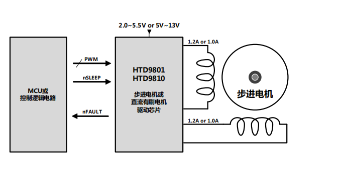 HTD9801/9810有兩路H橋驅(qū)動器,可以驅(qū)動兩個直流有刷電機,或者一個雙極步進電機,或者螺線管及其它感性負(fù)載。