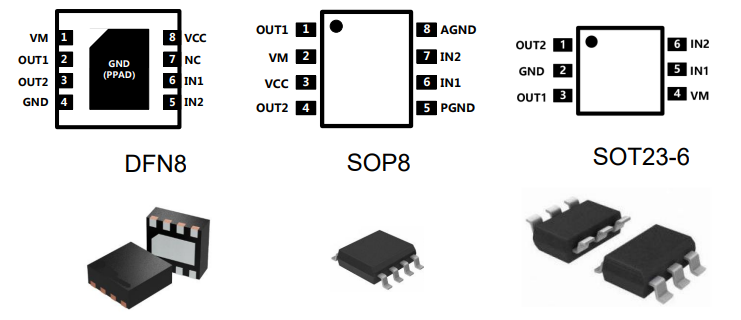 HTD9202提供三種封裝形式,一種是帶有散熱焊盤的DFN8 (2mm×2mm) 封裝,另兩種是SOP8和SOT23-6封裝,均是無鉛產(chǎn)品,符合環(huán)保標(biāo)準(zhǔn)。