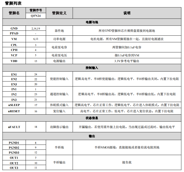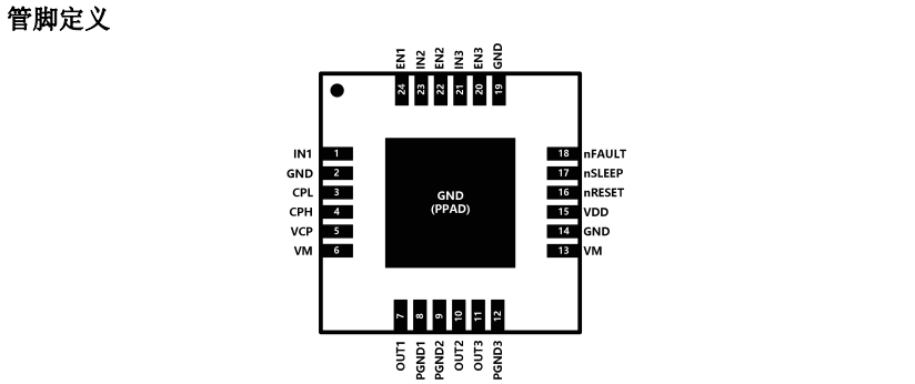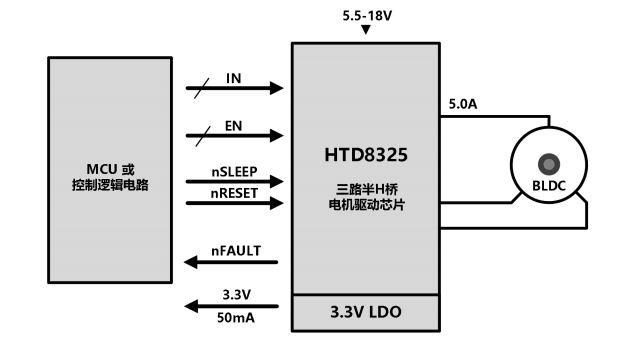 HTD8325是一款包含三路半橋且可獨立控制的驅(qū)動芯片,用于驅(qū)動一個三相直流無刷電機,或驅(qū)動螺線管等其它負載。每路半橋高、低邊均配置N通道功率MOSFET,可輸出5.0A峰值電流。低邊MOSFET的源端,即芯片的功率地可選擇接檢流電阻到地,以檢測輸出電流。