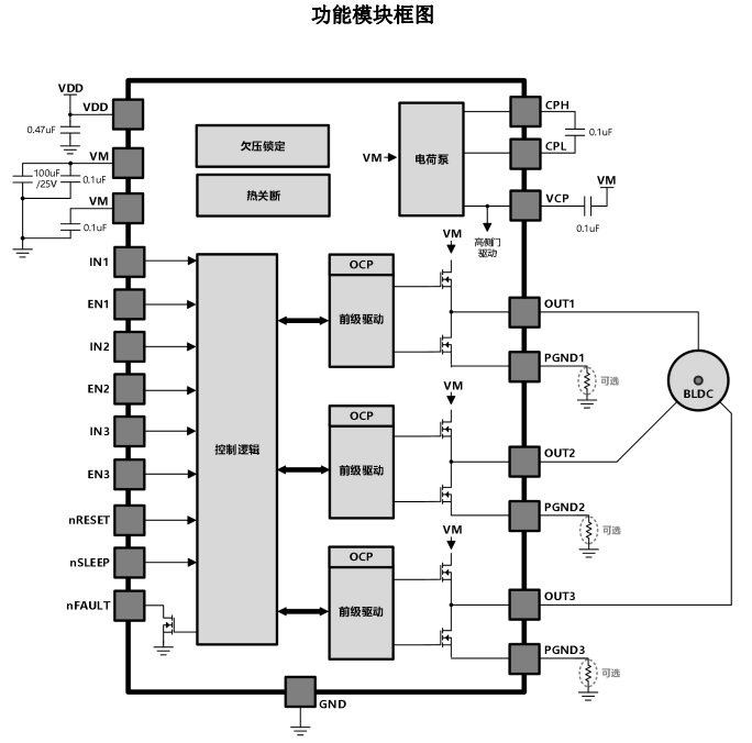 內(nèi)部保護功能包含過流保護,短路保護和過溫保護,并提供一個故障檢測輸出管腳。
