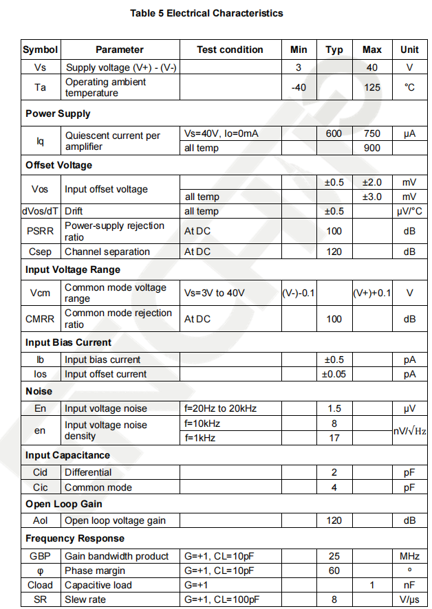 For Vs = (V+) - (V-) = 40V at Ta = 25°C, RL = 10kΩ connected to Vs/2, Vcm = Vs/2, and Vout